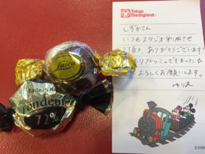 今回も お会い出来なかったのですが、お手紙とチョコが置いてありました。